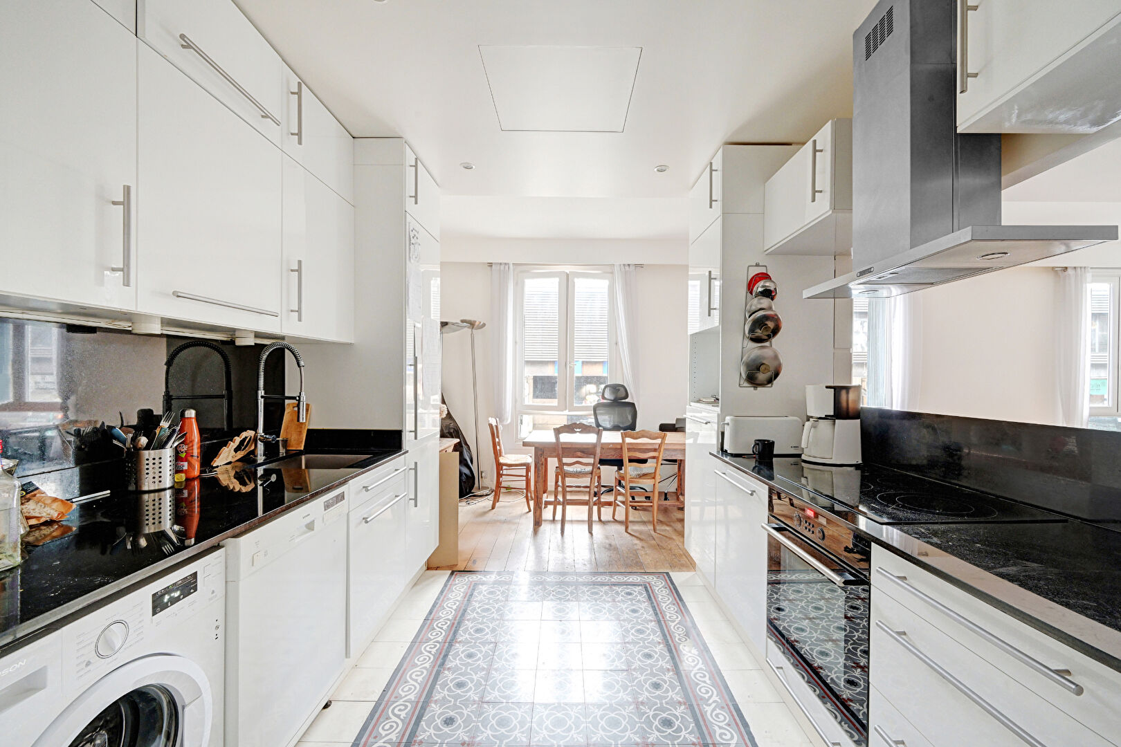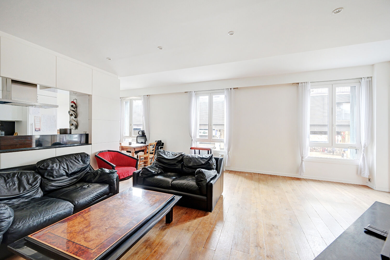 75014 PARIS. M° Montparnasse-Bienvenue. Rue du Départ. Dans une petite copropriété ancienne entièrement rénovée en 2001, en étage sans ascenseur. 4 pièces de 102,22m2 Carrez comprenant : entrée, grand séjour de 48m2 avec cuisine ouverte aménagée et équipée, 3 chambres dont 1 avec Salle d'eau attenante et 1 avec Salle de bain attenante, 1 WC séparé à l'entrée. Climatisation réversible avec pompe à chaleur. Double vitrage. Ensoleillé avec vue dégagée, sans vis à vis et exposition Ouest. 1 grande cave bétonnée avec porte blindée.
